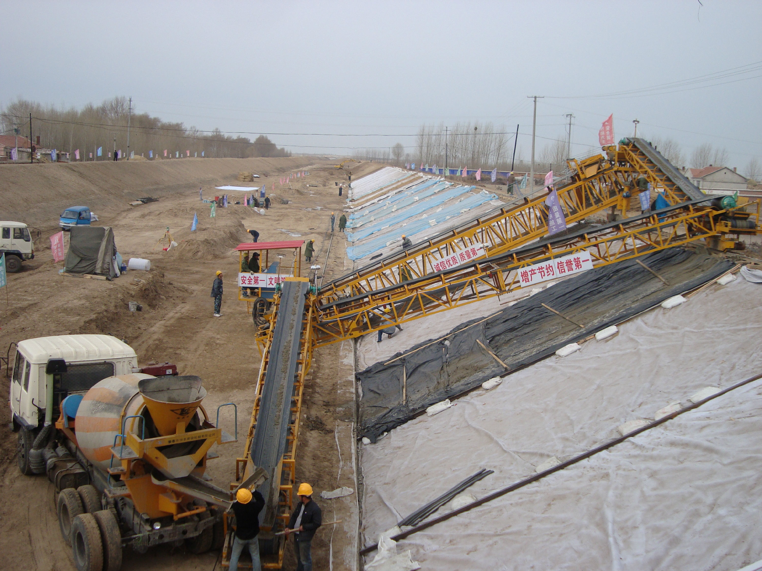 輸水總干渠坡面采用渠道襯砌機現(xiàn)澆8cm厚PP纖維混凝土板護砌,混凝土澆筑完成后采用機械切縫,切縫后混凝土板的規(guī)格1*1m,渠道橫縫和縱縫縫寬1cm。分縫填料上部采用聚硫密封膠(明渠專用),下部選用聚乙烯泡沫板填充?;炷涟鍓K下鋪一層復合土工膜(兩布一膜)進行防滲。為增加邊坡混凝土板的抗滑穩(wěn)定性,在坡腳設有現(xiàn)澆混凝土腳槽,腳槽底寬0.3m,頂寬0.5m,深0.5m。渠頂設有寬0.2m,高0.3m,長1m的現(xiàn)澆混凝土板塊封頂。